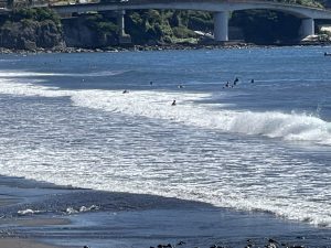 本日はサーフパンツにラッシュガードを着用してサーフィンを楽しみました。猛暑日が続いており、本日の最高気温は34度。海水温も高く、サーフパンツだけでも快適に入水できる状態です。ただし、日差しが非常に強いため、日焼け対策としてラッシュガードやサーフTシャツの着用を強くおすすめします。特に長時間のサーフィンでは、紫外線対策が重要です。また、朝夕の冷え込みや風が強い時間帯にはタッパー(上半身のウェットスーツ)があると安心です。急な気温変化や体温低下に備え、1着常備しておくとよいでしょう。